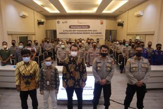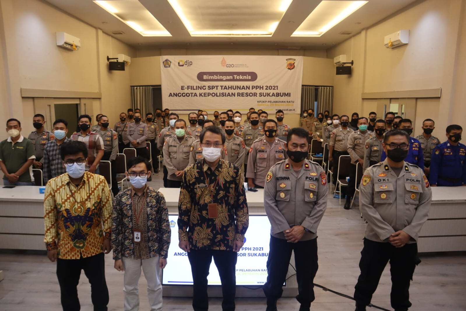 Kepala Kantor Pelayanan, Penyuluhan, dan Konsultasi Perpajakan (KP2KP) Pelabuhan Ratu Djoko Widodo bersama anggota Tim Penyuluh Pajak memberikan Bimbingan Teknis (Bimtek) Pengisian SPT Tahunan PPh Orang Pribadi Tahun Pajak 2021 kepada anggota Kepolisian Resor (Polres) Sukabumi di Aula Mapolres Sukabumi, Kabupaten Sukabumi, (Selasa,29/3).