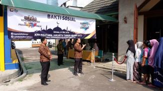 Bertempat di halaman belakang KPP Pratama Jakarta Tanah Abang Satu, acara bakti sosial dimulai dengan kegiatan bazar paket sembako murah dan bazar pakaian murah layak pakai.