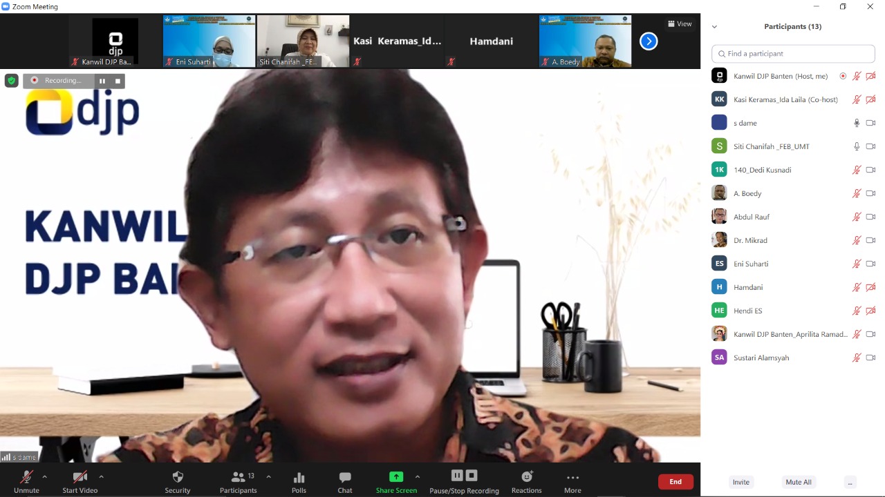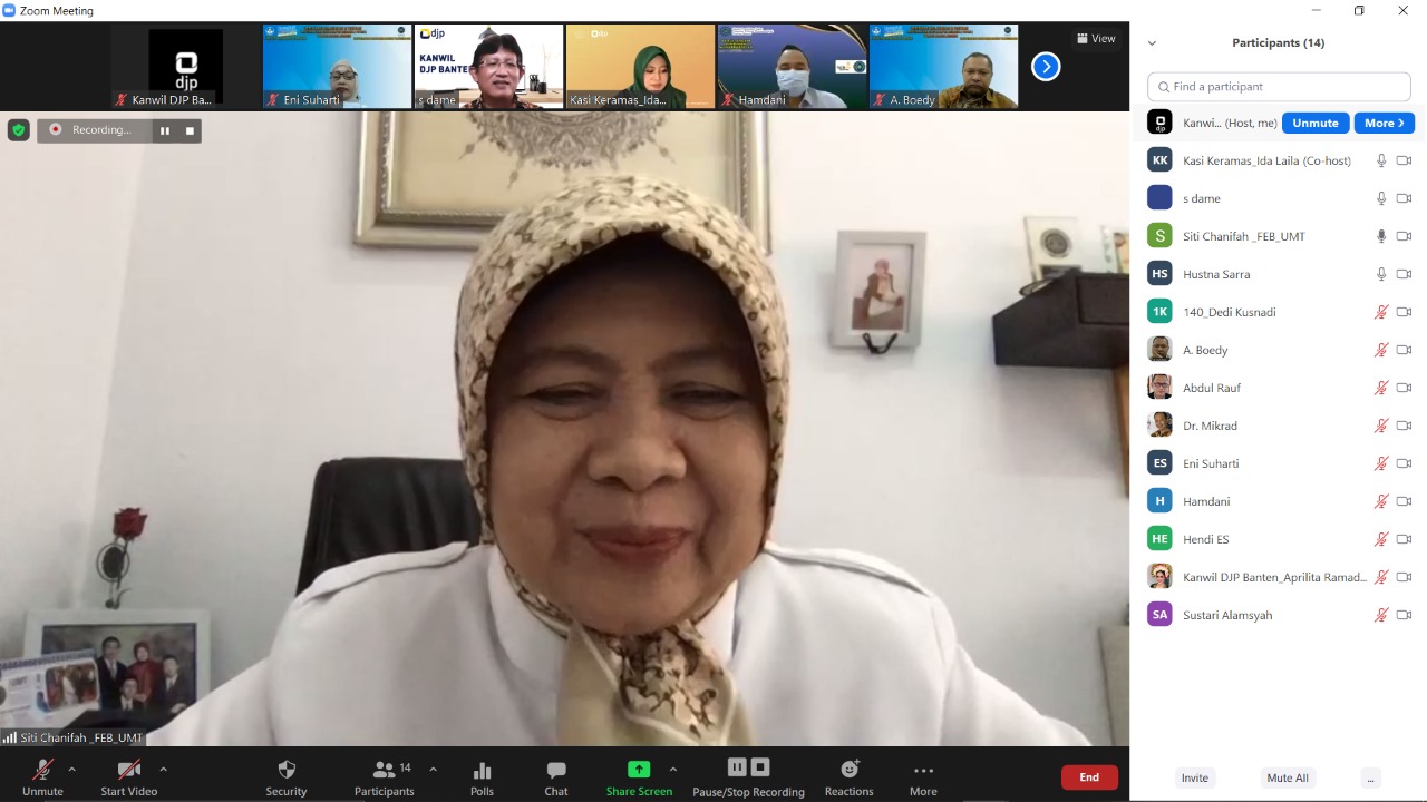 Bidang Penyuluhan, Pelayanan, dan Hubungan Masyarakat (P2Humas) Kantor Wilayah DJP Banten bersama Universitas Muhammadiyah Tangerang (UMT) melakukan rapat pembentukan Tax Center UMT secara virtual melalui Zoom Meeting di Banten (Selasa, 4/5).