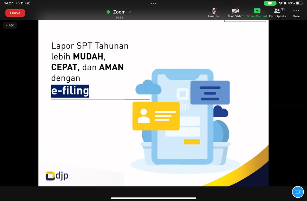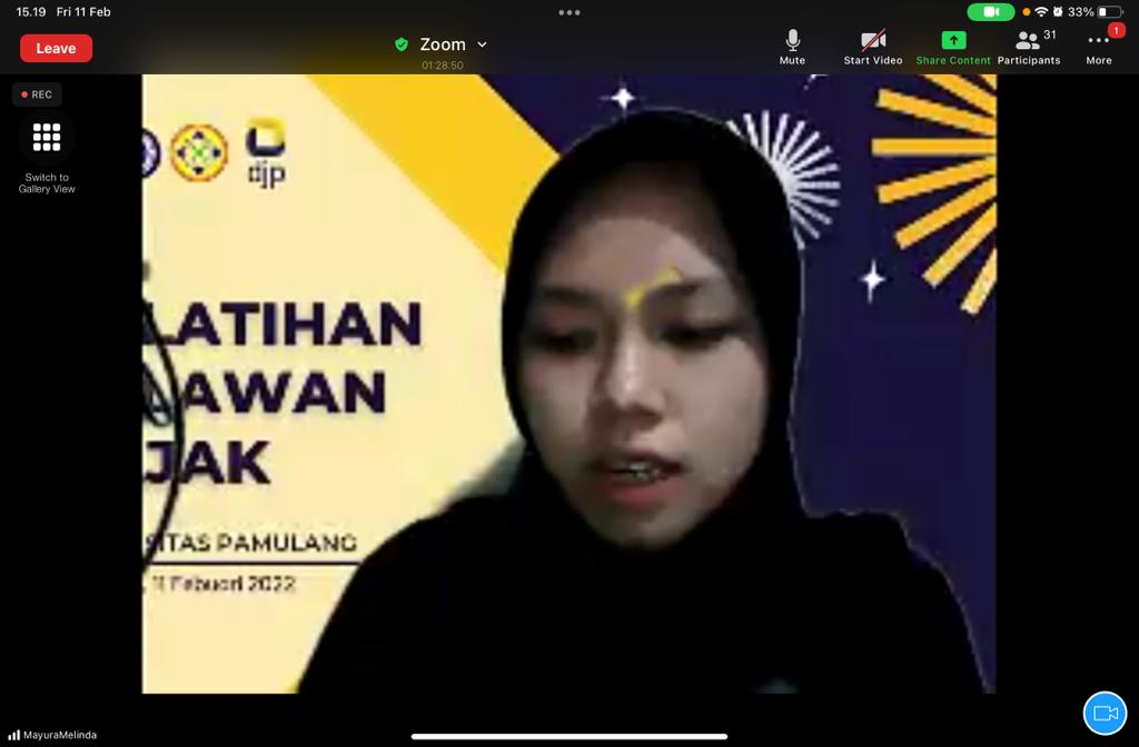 Sebagai persiapan pelaksanaan program Relawan Pajak Tahun 2022, para mahasiswa dibekali materi pelaporan SPT Tahunan melalui e-filing yang disampaikan oleh tim penyuluh pajak Kanwil DJP Banten. Kegiatan tersebut dilaksanakan dengan tujuan menambah pengetahuan perpajakan kepada mahasiswa/i UNPAM sebelum terjun langsung melayani wajib pajak.