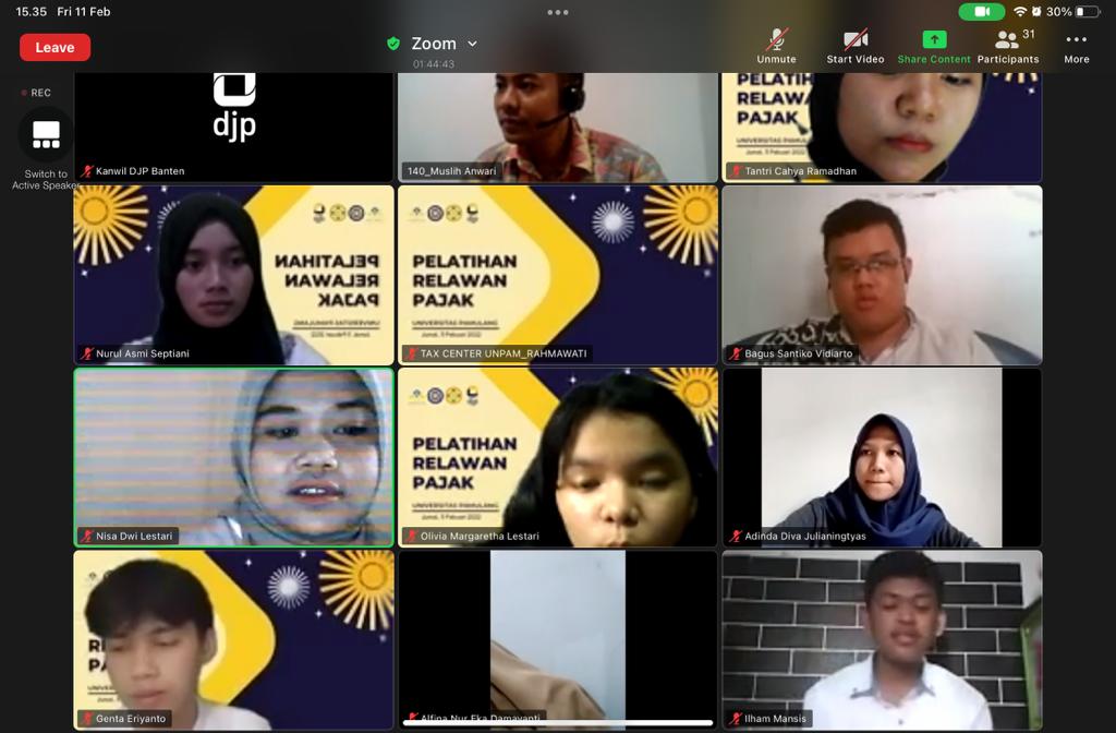 Kantor Wilayah DJP Banten bersama Tax Center Universitas Pamulang (Unpam) melakukan kegiatan pembekalan kepada relawan pajak secara daring melalui aplikasi zoom cloud meeting di Kota Serang, Banten (Jumat, 11/3).