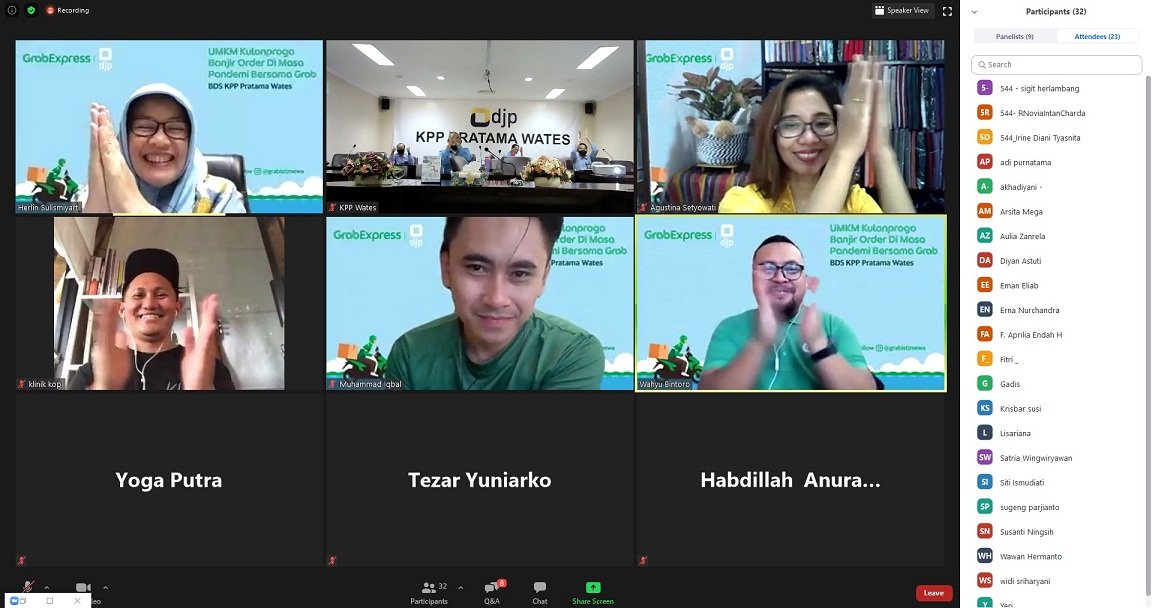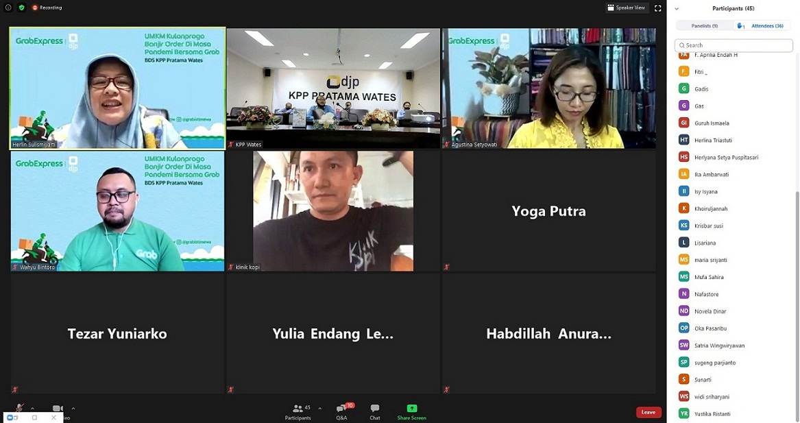 Diretorat Jenderal Pajak (DJP) melalui Kantor Pelayanan Pajak (KPP) Pratama Wates kerja sama dengan Grab Indonesia menggelar Webinar Business Development Services dengan tema "UMKM Kulon Progo Banjir Order di Masa Pandemi" dengan menggunakan media Zoom Meeting, di Yogyakarta (Rabu, 30/9).