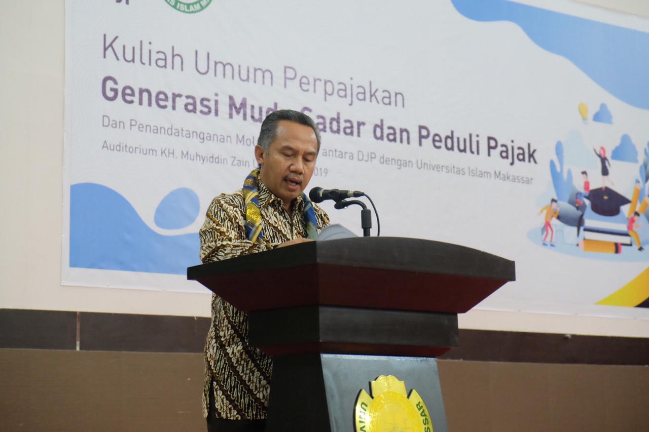 Kanwil DJP Sulawesi Selatan, Barat, dan Tenggara (Sulselbartra) bersama Universitas Islam Makassar (UIM) menggelar acara Kuliah Umum Perpajakan yang dirangkai dengan penandatanganan MoU Kerja Sama Tax Center antara DJP dengan UIM (Selasa, 25/6). Kegiatan yang dilangsungkan di Auditorium KH. Muhyiddin Zain UIM ini dihadiri oleh 400 mahasiswa/i UIM sebagai peserta acara.