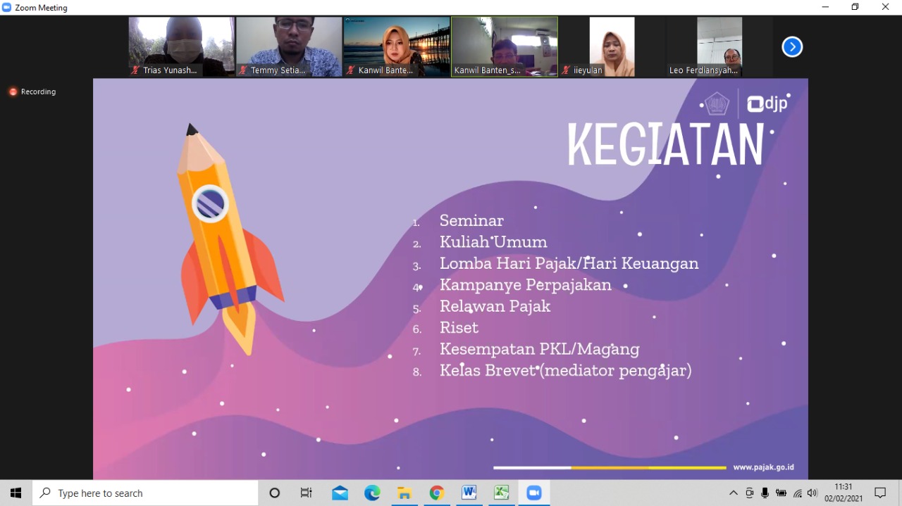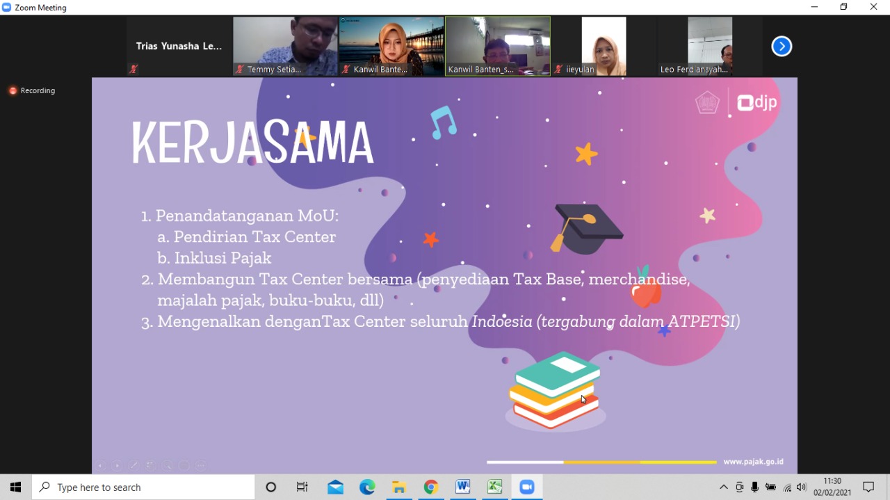 Bidang Penyuluhan, Pelayanan, dan Hubungan Masyarakat (P2Humas) Kantor Wilayah DJP Banten bersama Universitas Pramita Indonesia (Unpri) melakukan rapat pembentukan Tax Center Unpri secara virtual melalui Zoom Meeting di Banten (Selasa, 2/2).