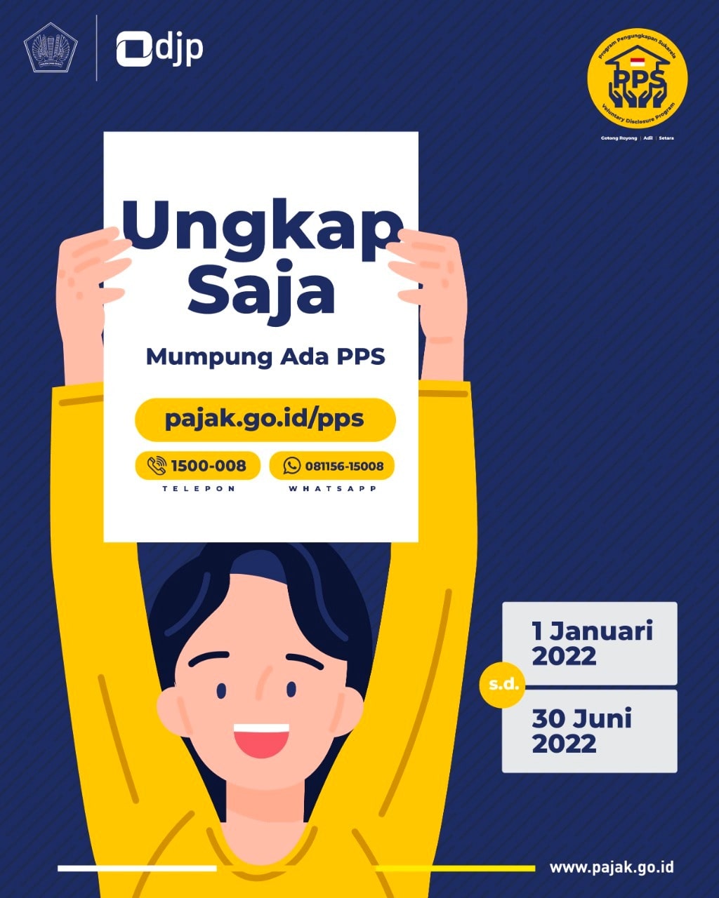 Pelaksanaan PPS ini diatur melalui Peraturan Menteri Keuangan Nomor 196/PMK.03/2021 tentang Tata Cara Pelaksanaan Program Pengungkapan Sukarela Wajib Pajak. “Para wajib pajak yang ingin mengikuti program ini dapat menyampaikan pengungkapannya secara elektronik melalui laman Direktorat Jenderal Pajak yakni pajak.go.id/pps mulai 01 Januari 2022 sampai dengan 30 Juni 2022,” ungkap Djamhari.