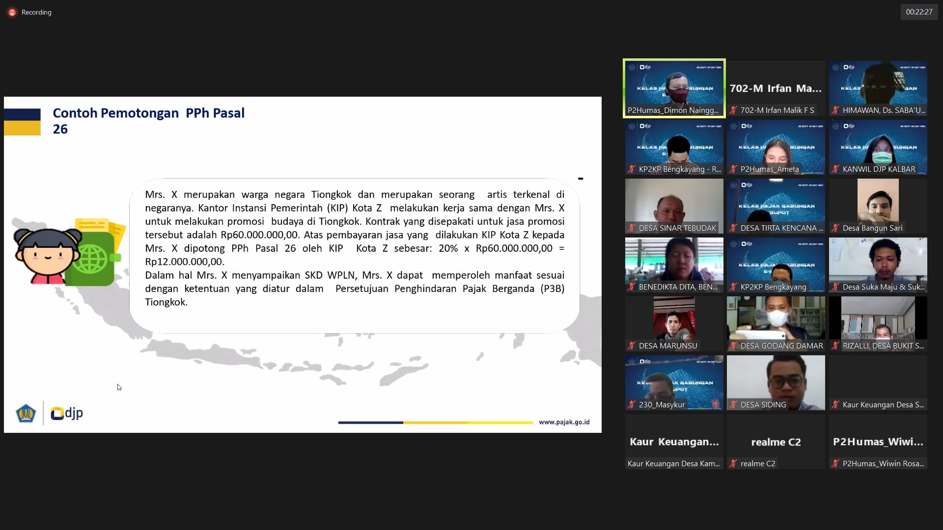 40 Perwakilan Instansi Pemerintah Kabupaten Bengkayang hadir pada kelas pajak terkait kewajiban Bendaharawan Pemerintah Desa dan implementasi aplikasi e-Bupot Unifikasi Instansi Pemerintah. Kegiatan ini diselenggarakan oleh Kantor Pelayanan Penyuluhan dan Konsultasi Perpajakan (KP2KP) Bengkayang dan Kantor Wilayah Direktorat Jenderal Pajak (DJP) Kalimantan Barat via Zoom Meeting di Bengkayang (Selasa, 21/9).