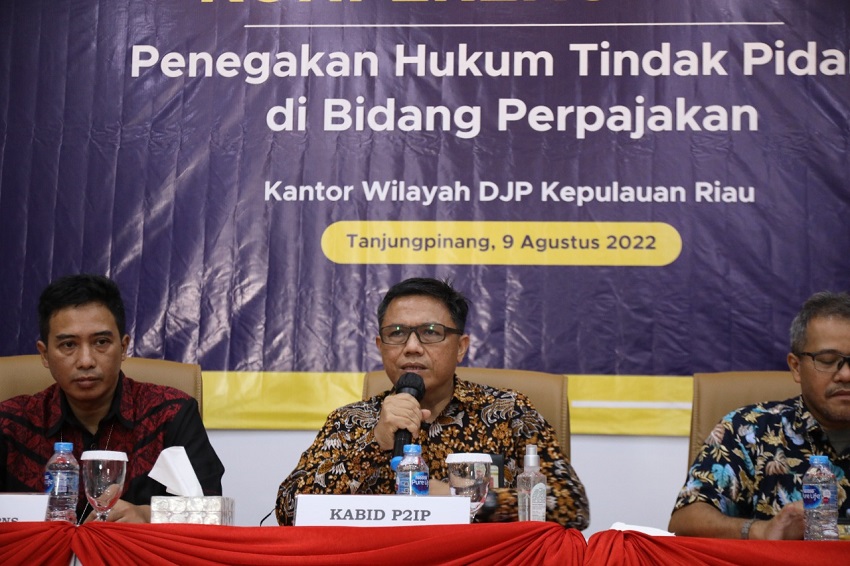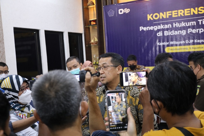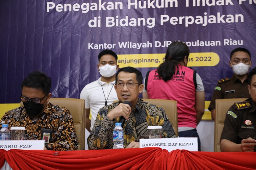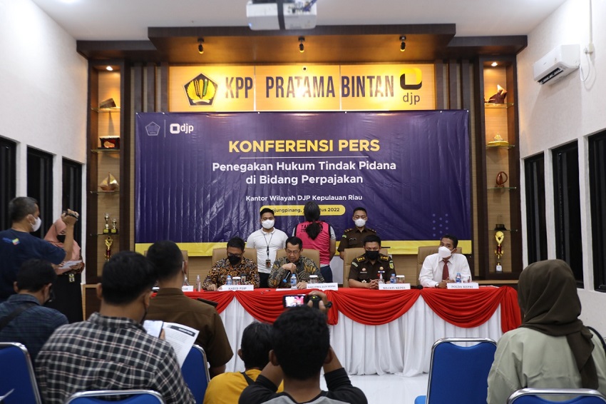 Kantor Wilayah Direktorat Jenderal Pajak Kepulauan Riau (Kanwil DJP Kepri) menggelar Konferensi Pers “Penegakan Hukum Tindak Pidana di Bidang Perpajakan” di Aula Kantor Pelayanan Pajak (KPP) Pratama Bintan, Tanjungpinang, Kepulauan Riau (Selasa, 9/8).