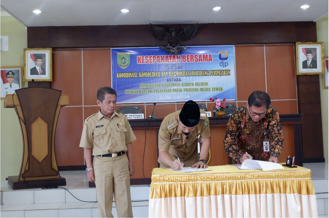Buntok-Pemerintah Kabupaten Barito Selatan, Kalimantan Tengah bersama dengan Kantor Pelayanan Pajak Muara Teweh melaksanakan penandatangan nota kesepahaman optimalisasi penerimaan pajak pusat, dan daerah (Selasa, 18/6).