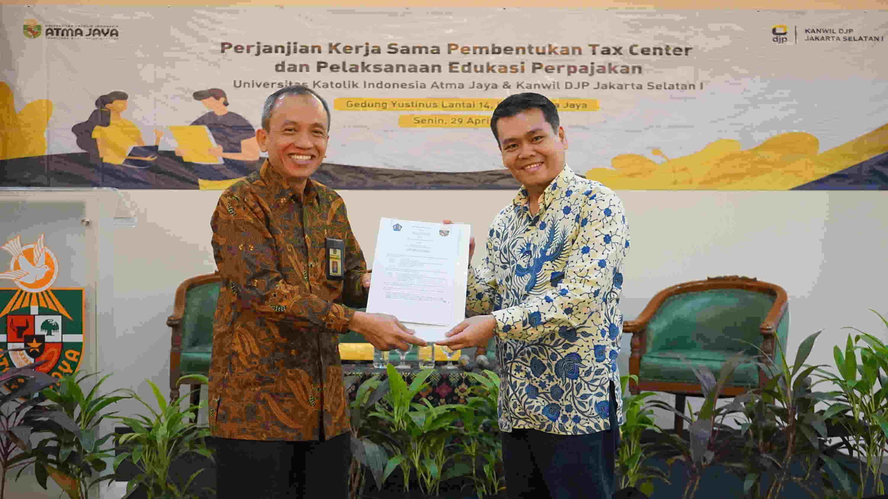 Bertempat di Aula Yustinus Gedung B Universitas Katolik Atma Jaya Jakarta telah dilaksanakan Penandatanganan Nota Kesepahaman/Memory of Understanding (MoU) tentang pembentukan Tax Center antara DJP dengan Universitas Katolik Atma Jaya Jakarta (Senin, 29/4). Tax Center ini merupakan Tax Center keenam di Kanwil DJP Jakarta Selatan I. Sekitar 80 mahasiswa/i serta para civitas akademika hadir dalam acara tersebut. Sebagai pembukaan, seluruh peserta secara bersama-sama menyanyikan lagu Indonesia Raya.