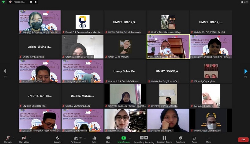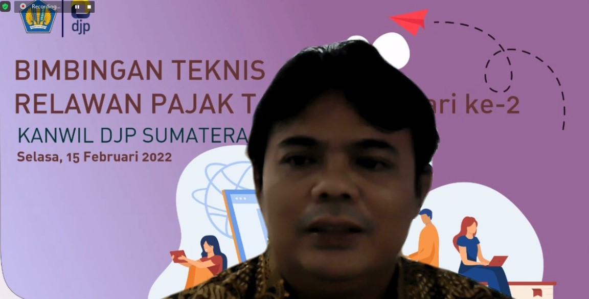 Kantor Wilayah Direktorat Jenderal Pajak (Kanwil DJP) Sumatera Barat dan Jambi memberikan Bimbingan Teknis Communication Skill dan Kepemimpinan bagi relawan pajak di wilayah Sumatera Barat dan Jambi secara daring di Padang, Sumatera Barat (Selasa, 15/02).