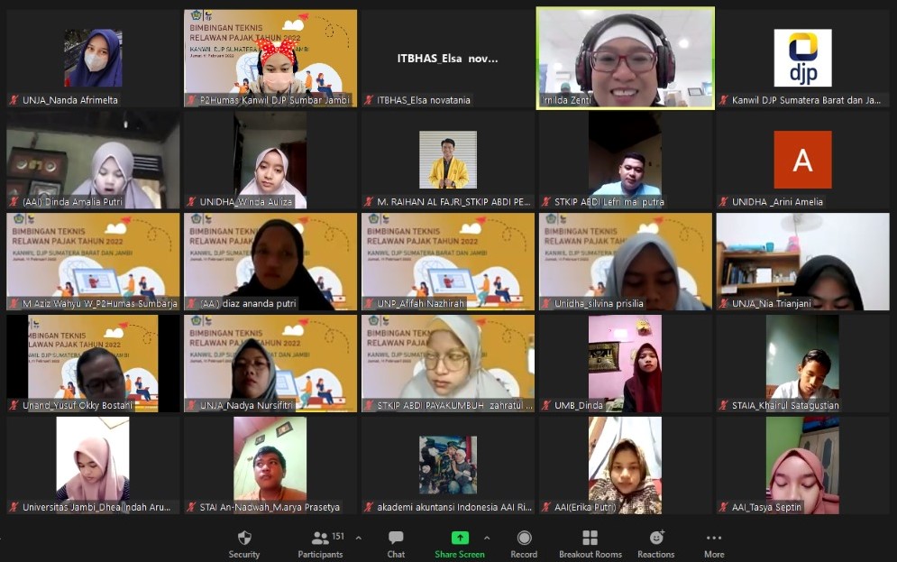 Kantor Wilayah Direktorat Jenderal Pajak (Kanwil DJP) Sumatera Barat dan Jambi memberikan edukasi perpajakan berupa Bimbingan Teknis bagi relawan pajak di wilayah Sumatera Barat dan Jambi secara daring di Padang, Sumatera Barat (Jumat, 11/02).