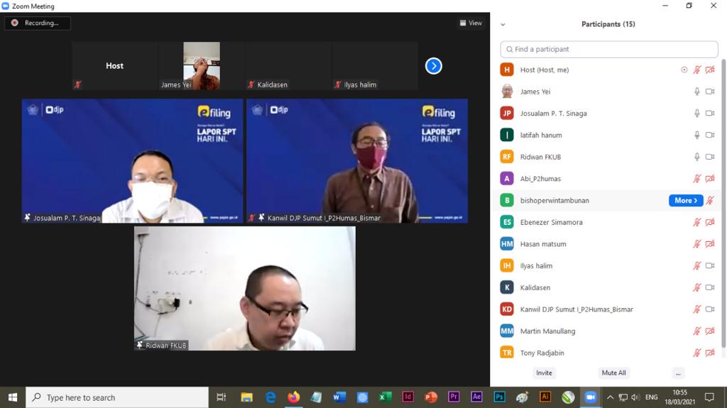Kantor Wilayah Direktorat Jenderal Pajak (Kanwil DJP) Sumatera Utara I memberikan pembekalan kepada 21 Relawan Pajak Non Mahasiswa dari Asosiasi/Organisasi Perkumpulan (Kamis, 18/3). Pembekalan ini dilakukan secara daring melalui aplikasi zoom di ruang rapat Kanwil DJP Sumatera Utara I, Medan.