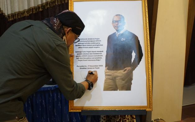Dukungan tersebut disampaikan secara simbolik berupa penandatanganan piagam apresiasi pada saat kunjungan kerjanya ke Kantor Pelayanan Pajak (KPP) Pratama Purwokerto di Aula Kantor Pelayanan Pajak (KPP) Pratama Purwokerto, Purwokerto Timur, Banyumas (Jumat, 17/11).
