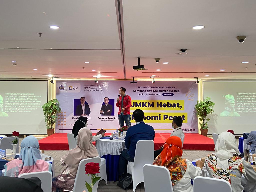 KPP Pratama Kembangan mengundang dua narasumber untuk mengisi acara BDS kali ini, yaitu Juanda Rovelim, seorang pakar digital marketing dan Paulus Sulastri S.Kom M.A, seorang business coach. Kedua narasumber tersebut dihadirkan untuk memberikan ilmu, tips, dan motivasi dalam menjalankan usaha kepada para pelaku UMKM agar dapat mengembangkan usaha yang dimiliki.