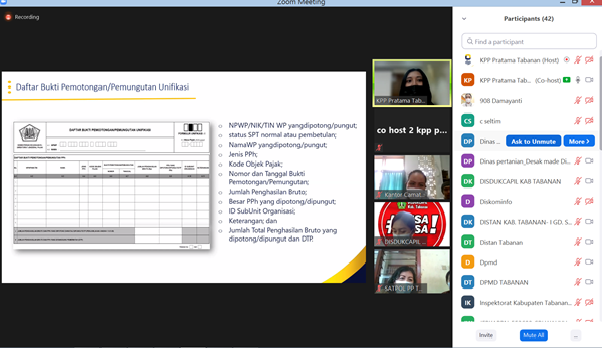 Kantor Pelayanan Pajak (KPP) Pratama Tabanan mengadakan Edukasi Perpajakan Tata Cara Pembuatan Bukti Pemotongan/Pemungutan Unifikasi dan Penyampaian Surat Pemberitahuan Masa Pajak Penghasilan Unifikasi Instansi Pemerintah di wilayah Kabupaten Tabanan, Bali (Kamis, 8/7). Kegiatan diselenggarakan secara daring melalui aplikasi Zoom Meeting.