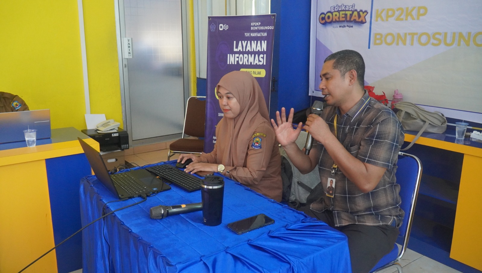 Kantor Pelayanan, Penyuluhan, dan Konsultasi Perpajakan (KP2KP) Bontosunggu bersama Tim Penyuluh Pajak Kantor Pelayanan Pajak (KPP) Pratama Bantaeng menggelar sosialisasi sistem Coretax DJP bagi para bendahara desa se-Kabupaten Jeneponto. Kegiatan berlangsung di Ruang Konsultasi KP2KP Bontosunggu selama empat hari di Kabupaten Jeneponto (Senin, 28/7).