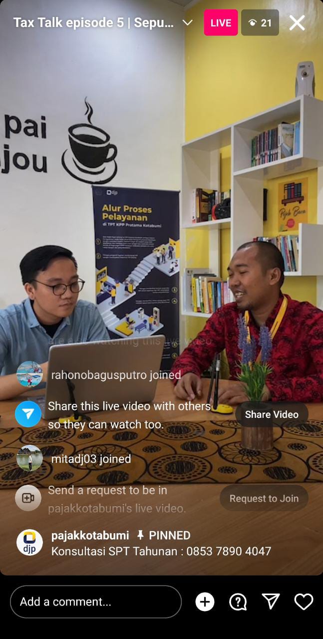 Kantor Pelayanan Pajak (KPP) Pratama Kotabumi mengadakan siaran langsung melalui sosial media Instagram (Live Instagram) KPP Pratama Kotabumi membahas tentang pajak bertempat di Pojok Kopi Tempat Pelayanan Terpadu KPP Pratama Kotabumi, Kabupaten Lampung Utara (Kamis, 02/02). Kegiatan ini dibawakan oleh 1 (satu) Fungsional Penyuluh Perpajakan, Sahyani.