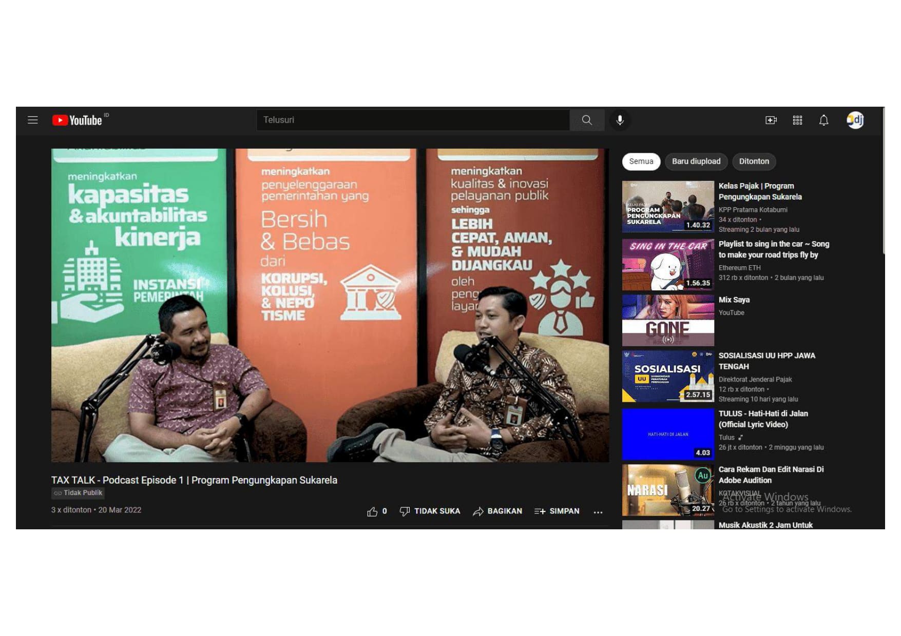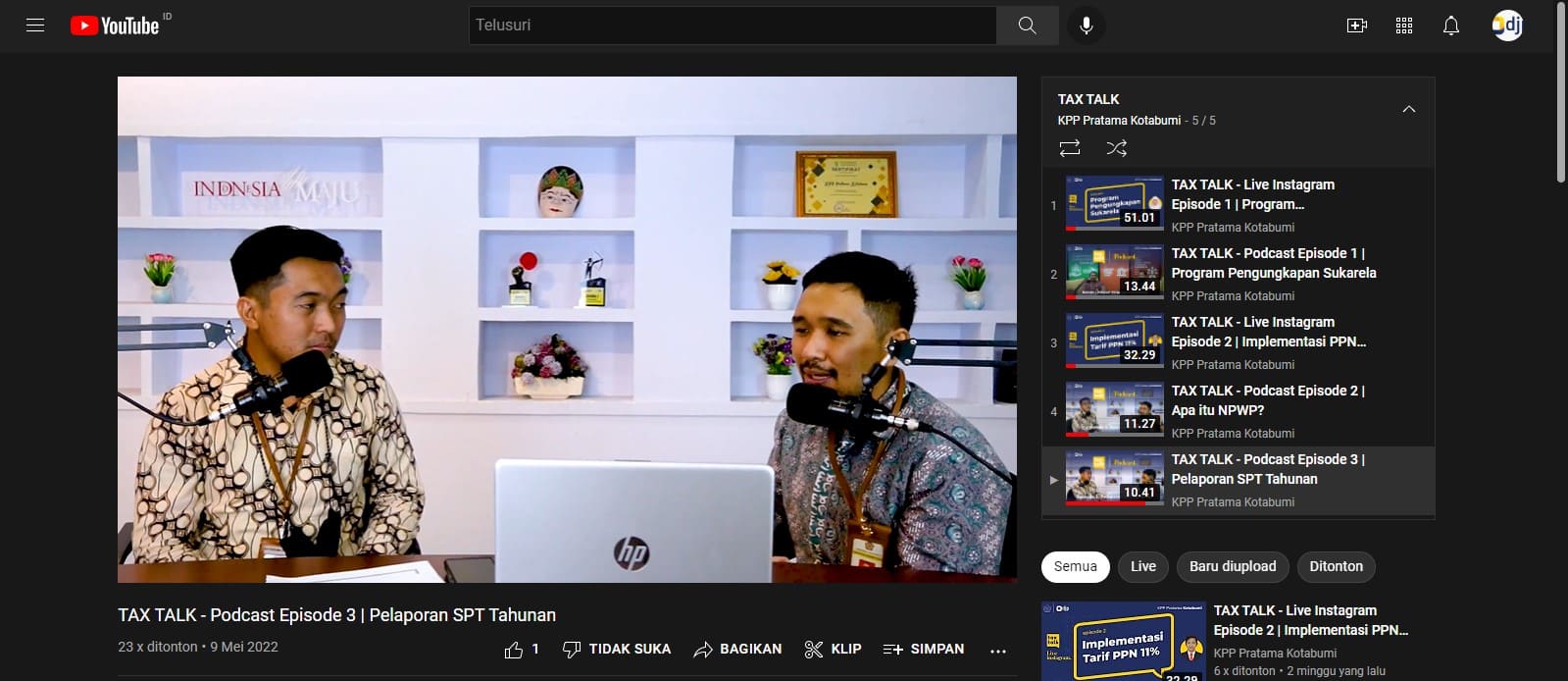 Kantor Pelayanan Pajak (KPP) Pratama membuat siniar (podcast) Tax Talk yang membahas tentang pajak di kanal resmi Youtube KPP Pratama Kotabumi dan live Instagram Pajak Kotabumi bertempat di Ruang Podcast KPP Pratama Kotabumi, Kabupaten Lampung Utara (Selasa, 21/06). Kegiatan ini telah berlangsung selama 3 (tiga) kali setiap bulannya. Acara dibawakan oleh 2 (dua) pegawai KPP Pratama Kotabumi.
