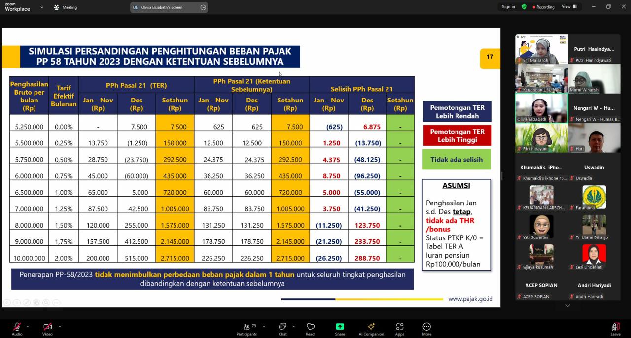 Dalam sesi yang berlangsung dari pukul 14.00 hingga 15.30 WIB ini, para peserta mendapatkan edukasi mengenai dasar-dasar perpajakan, serta penjelasan teknis dan praktis mengenai perubahan kebijakan dalam PP Nomor 58 Tahun 2023. Penjelasan tersebut mencakup metode penghitungan pajak terbaru dengan pendekatan tarif efektif rata-rata yang menggantikan skema lama sehingga diharapkan mempermudah perhitungan dan kepatuhan pajak bagi pegawai.