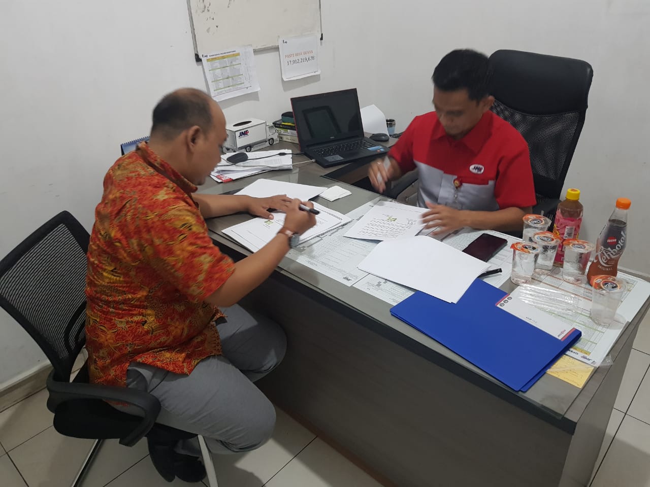 Kantor Pelayanan, Penyuluhan dan Konsultasi Pajak (KP2KP) Tanjung Selor mendatangi kantor JNE di Bulungan (Jumat, 26/11). Kunjungan tersebut dilakukan untuk melaksanakan evaluasi atas kerja sama yang telah dilakukan selama ini khususnya terkait pengiriman berkas dan evaluasi penyampaian surat. Dalam kunjungannya beliau disambut Aziz selaku perwakilan JNE Bulungan dalam ruangan kerjanya.