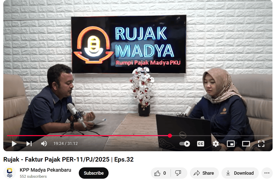 Kantor Pelayanan Pajak (KPP) Madya Pekanbaru kembali menyapa wajib pajak melalui podcast RUJAK (Rumpi Pajak KPP Madya Pekanbaru) dengan episode terbaru dan kali ini dipandu oleh Febby Adika Lubis serta ditemani oleh narasumber, Azwar Hidayat, Penyuluh Pajak KPP Madya Pekanbaru, untuk membahas topik seluk beluk faktur pajak yang ditayangkan melalui kanal YouTube KPP Madya Pekanbaru (Senin, 30/6).