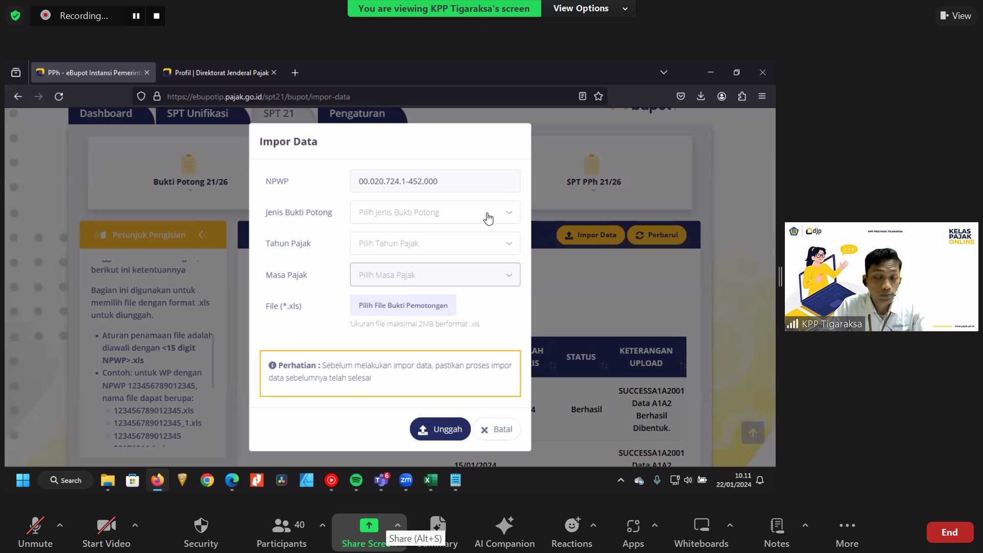 Kantor Pelayanan Pajak (KPP) Tigaraksa menyelenggarakan Kelas Pajak mengenai e-Bupot Unifikasi Instansi Pemerintah. Kelas Pajak ini diselenggarakan langsung dari ruang studio KPP Pratama Tigaraksa secara daring melalui aplikasi Zoom Cloud Meeting KPP Pratama Tigaraksa (Senin, 22/1).