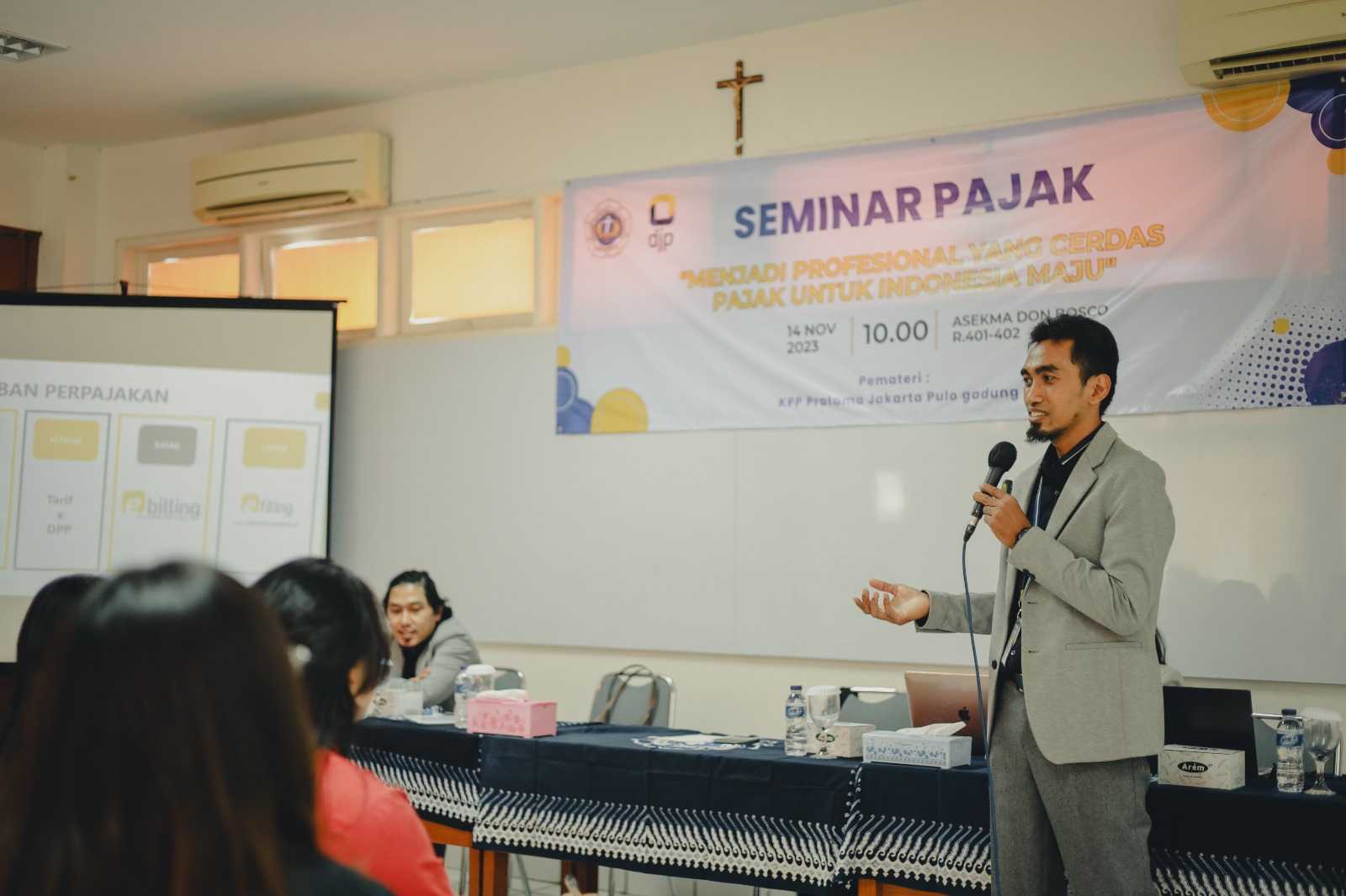 Seminar pajak kali ini mengusung tema “Menjadi Profesional yang Cerdas Pajak untuk Indonesia Maju". Kegiatan dibuka dengan sambutan dari Direktur Akademi Sekretari dan Manajemen (Asekma) Don Bosco, Sulistiyono. Dilanjutkan dengan pembekalan materi tentang perpajakan yang disampaikan oleh Tim Fungsional Penyuluh Pajak KPP Pratama Jakarta Pulogadung.