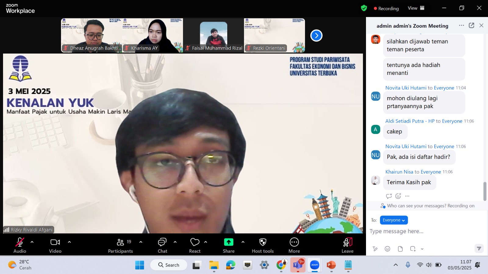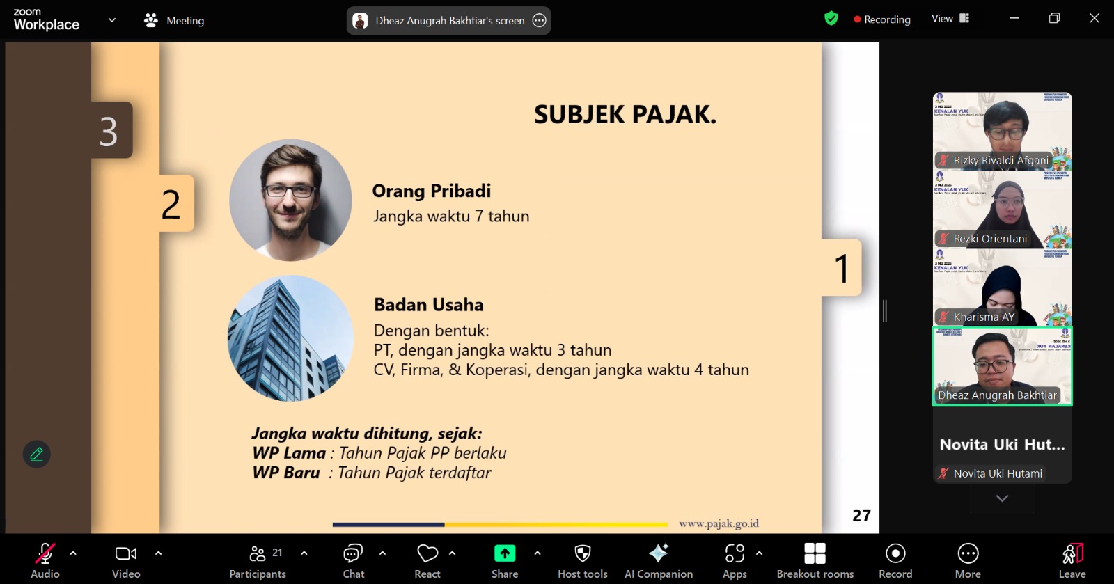 Penyuluh Pajak, Dheaz Anugrah Bakhtiar, bertindak sebagai narasumber dalam kegiatan tersebut. Pada kegiatan ini, Dheaz didampingi oleh Dosen Program Studi Pariwisata FEB Universitas Terbuka, Rizky Rivaldi Afgani, yang berperan sebagai moderator.