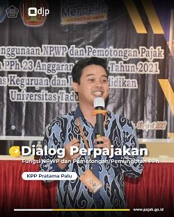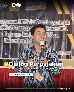 Kantor Pelayanan Pajak (KPP) Pratama Palu bekerja sama dengan Fakultas Keguruan dan Ilmu Pendidikan (FKIP) Universitas Tadulako Palu menyelenggarakan Dialog Perpajakan bertajuk "Fungsi NPWP dan Pemotongan/Pemungutan Pajak" di Ballroom Sutan Raja Hotel Palu (Kamis, 1/4).