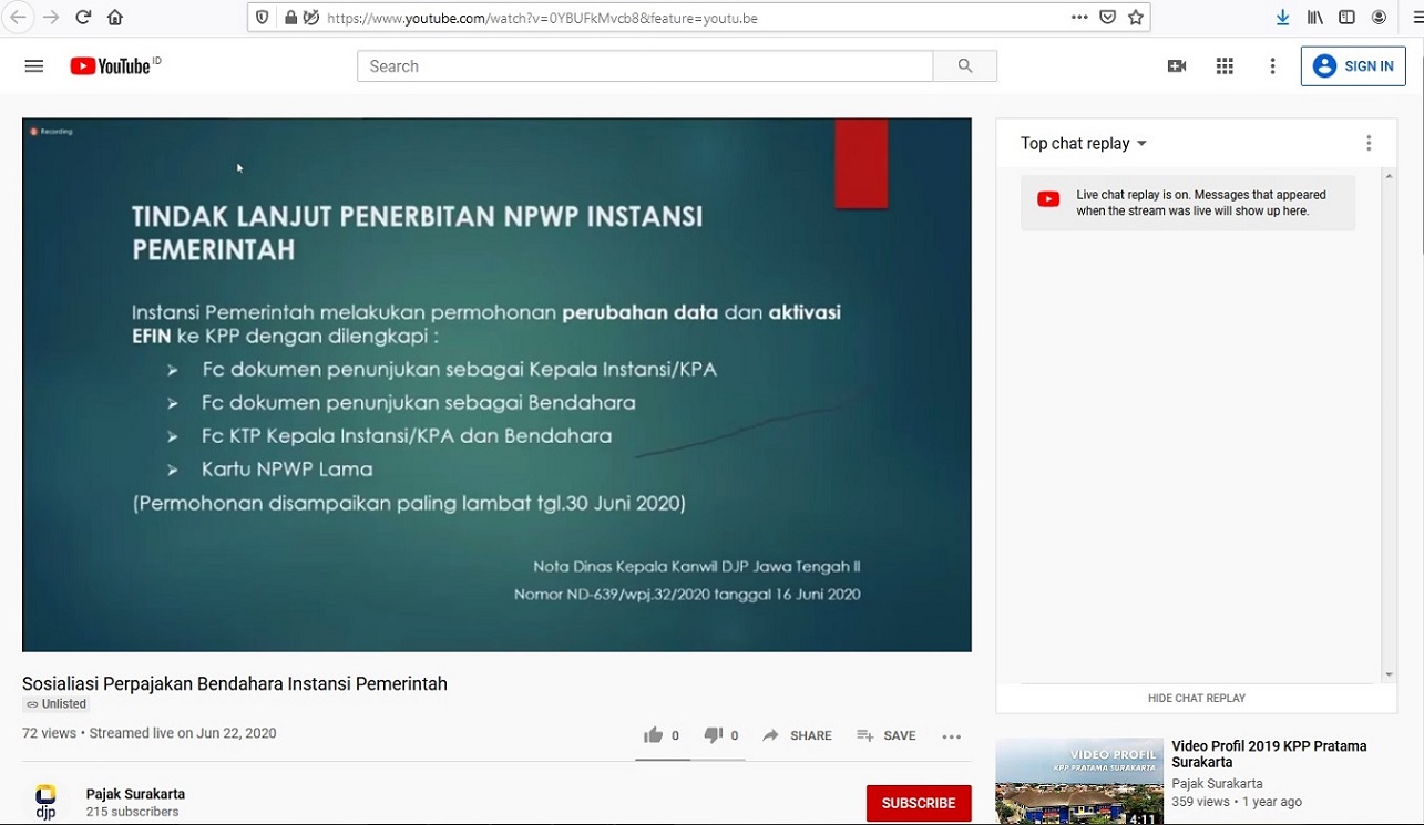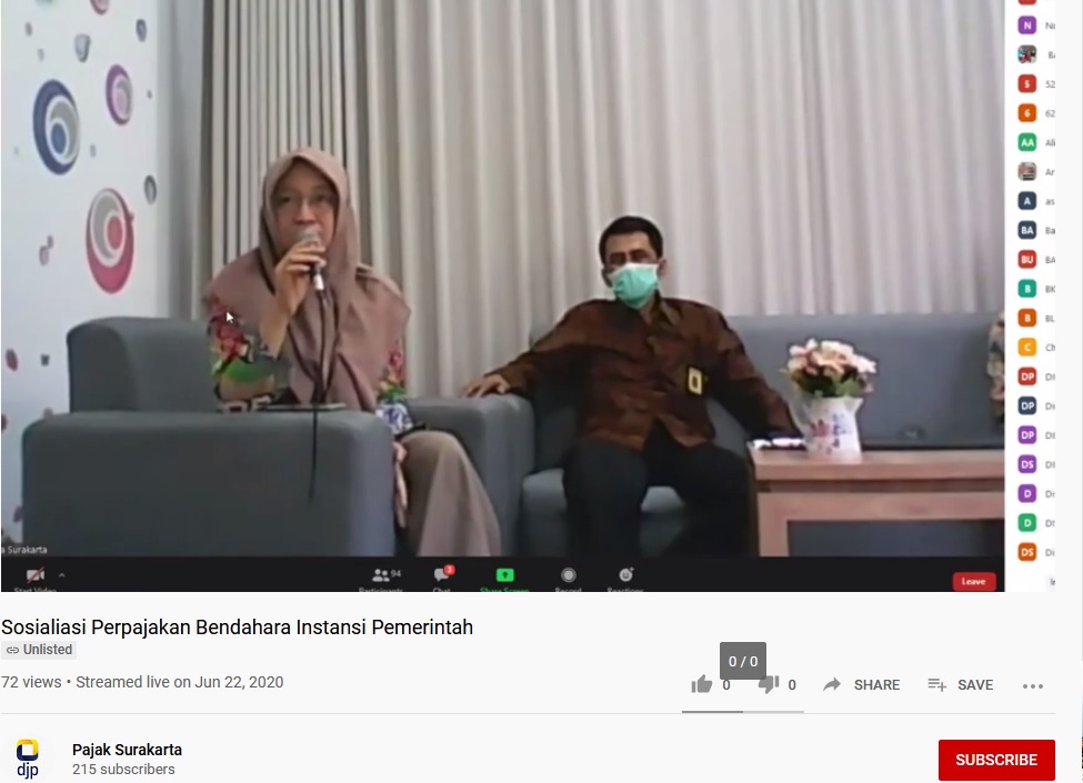 KPP Pratama Surakarta sosialisasikan NPWP Baru bagi Instansi Pemerintah selama dua hari berturut-turut melalui webinar di Surakarta (Selasa, 23/6). Bekerja sama dengan KPPN Surakarta, webinar NPWP Baru bagi Instansi Pemerintah Pusat telah terselenggara melalui Zoom pada tanggal 22 Juni 2020. Sedangkan webinar NPWP Baru bagi Instansi Pemerintah Daerah dilaksanakan pada 23 Juni 2020. BPPKAD Kota Surakarta mengundang para bandahara OPD Pemerintah Kota Surakarta untuk mengikuti webinar yang diselenggarakan secara daring melalui aplikasi Zoom, Whatsapp, dan Youtube.