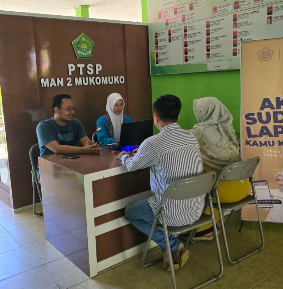 Kantor Pelayanan, Penyuluhan, dan Konsultasi Perpajakan (KP2KP) Mukomuko kembali menunjukkan komitmennya dalam mendekatkan layanan perpajakan kepada masyarakat melalui penyelenggaraan pojok pajak di MAN 2 Mukomuko, Jalan Transito, Bandar Ratu, Kota Mukomuko (Sabtu, 12/7). Momentum libur sekolah dimanfaatkan KP2KP Mukomuko untuk menyasar para guru dan staf madrasah yang belum melaporkan surat pemberitahuan (SPT) tahunan tanpa terganggu kegiatan belajar mengajar.