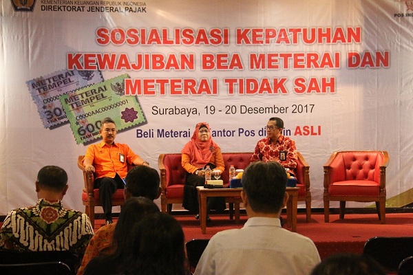 Kantor Wilayah Direktorat Jenderal Pajak Jawa Timur I bekerjasama dengan PT. Pos Indonesia (Persero) Regional VII Surabaya, melakukan Sosialisasi Kepatuhan Kewajiban Bea Meterai dan Meterai Tidak Sah di Kanwil DJP Jatim I (Selasa, 19/12). Kegiatan ini bertujuan untuk mengingatkan kembali kepada wajib pajak karena Bea Meterai adalah pajak atas dokumen sebagaimana dinyatakan dalam Undang-Undang Nomor 13 Tahun 1985 tentang Bea Meterai.