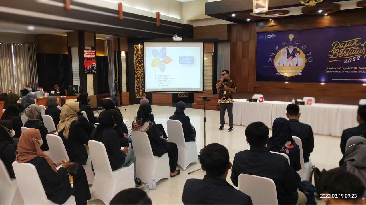 Puluhan mahasiswa Institut Teknologi Bisnis (ITB) AAS Surakarta mengikuti kuliah umum bertema "Penagihan Dan Sengketa Pajak" yang digelar oleh Kantor Wilayah DJP Jawa Tengah II di Surakarta (Jumat, 19/8). Acara ini dilaksanakan di aula Kanwil DJP Jawa Tengah II dan dibuka langsung oleh Kepala Bidang P2Humas Wiratmoko. Sebagai narasumber dalam kuliah umum adalah Fungsional Penyuluh Pajak Madya Timon Pieter.