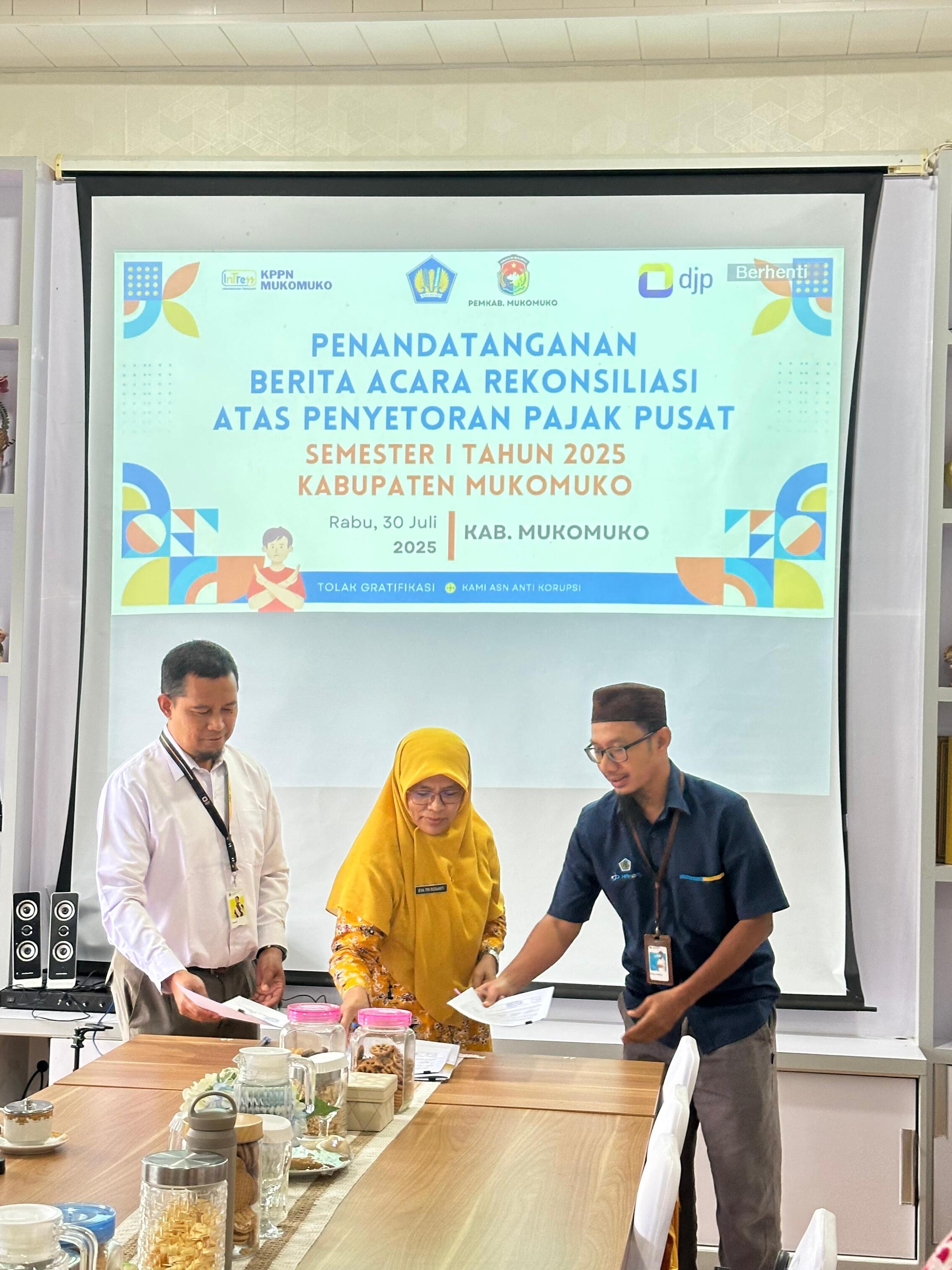 Acara tersebut dihadiri oleh Siswadi selaku Kepala KP2KP Mukomuko, Wahyu Budiarso selaku Kepala KPPN Mukomuko, dan Eva Tri Rosanti selaku Kepala Badan Keuangan Daerah (BKD) Kabupaten Mukomuko. Ketiga pimpinan instansi tersebut menandatangani dokumen berita acara rekonsiliasi sebagai bukti kesesuaian data dan komitmen bersama dalam menjaga integritas pelaporan dan penyetoran pajak ke kas negara.