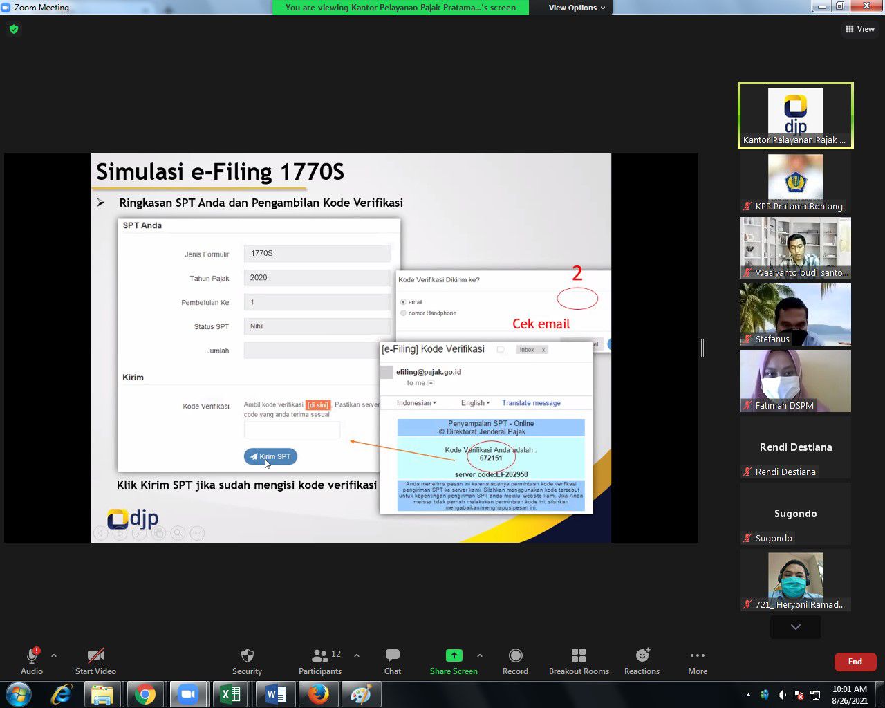 Kegiatan ini dilaksanakan dengan memanfaatkan media Zoom Clouds Meeting dikarenakan adanya pandemi virus Covid-19. Materi yang disampaikan adalah terkait pelaporan SPT Tahunan 1770 SS dan SPT Tahunan 1770 S. Diharapkan dengan adanya kelas pajak ini, wajib pajak dapat memahami cara pelaporan pajaknya dan dapat segera melaporkan pajak yang belum dilaporkan.