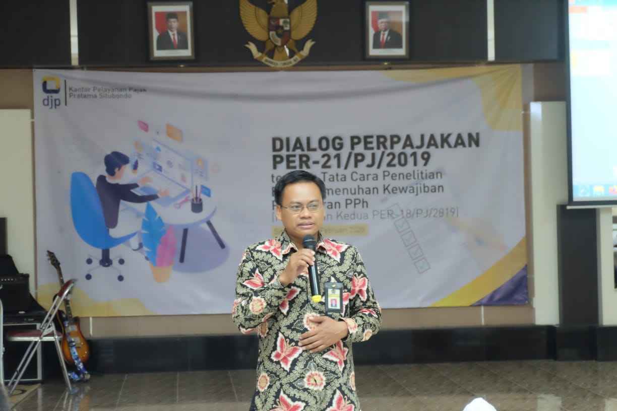 KPP Pratama Situbondo menyelenggarakan Dialog Perpajakan yang mempertemukan seluruh PPAT se-Kabupaten Situbondo di Aula KPP Pratama Situbondo (Selasa, 25/2). Dalam acara tersebut secara khusus membahas tentang PER-21/PJ/2019 yang baru ditetapkan dan berlaku mulai 30 Desember 2019 lalu. Adapun PER-21/PJ/2019 merupakan perubahan kedua atas PER-18/PJ/2017 yang berkaitan dengan penelitian bukti pemenuhan kewajiban pembayaran PPh atas pengalihan hak atas tanah dan/atau bangunan.