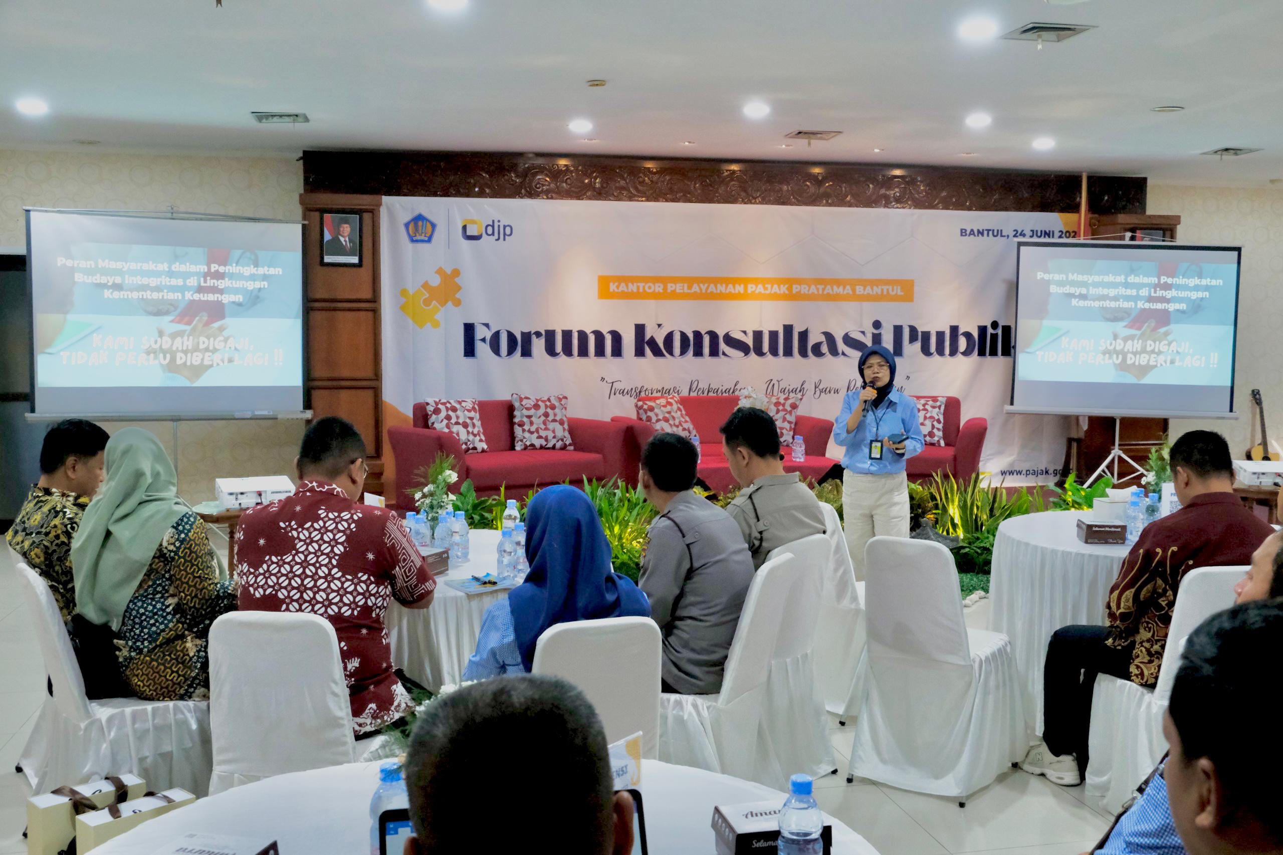 Kantor Pelayanan Pajak (KPP) Pratama Bantul menyelenggarakan kegiatan Forum Konsultasi Publik (FKP) bertempat di Aula KPP Pratama Bantul, Kabupaten Bantul (Selasa, 24/6). Forum yang mengusung tema "Transformasi Perpajakan: Wajah Baru Pelayanan" bertujuan untuk meningkatkan kualitas layanan publik.