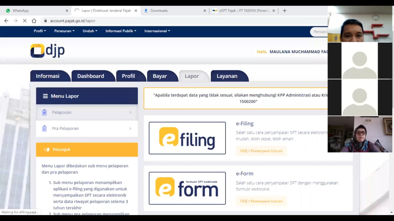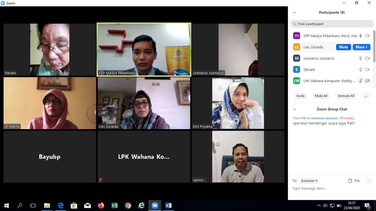 KPP Madya Pekanbaru menggelar Kelas Pajak Daring (Online) batch 1 dengan tema Tata Cara Pelaporan SPT Tahunan PPh Orang Pribadi melalui e-Filing dengan menggunakan sarana aplikasi zoom di tempat masing-masing (Kamis, 23/4). Kelas pajak ini dibagi menjadi dua sesi, yakni pukul 10.00 WIB dan 14.00 WIB