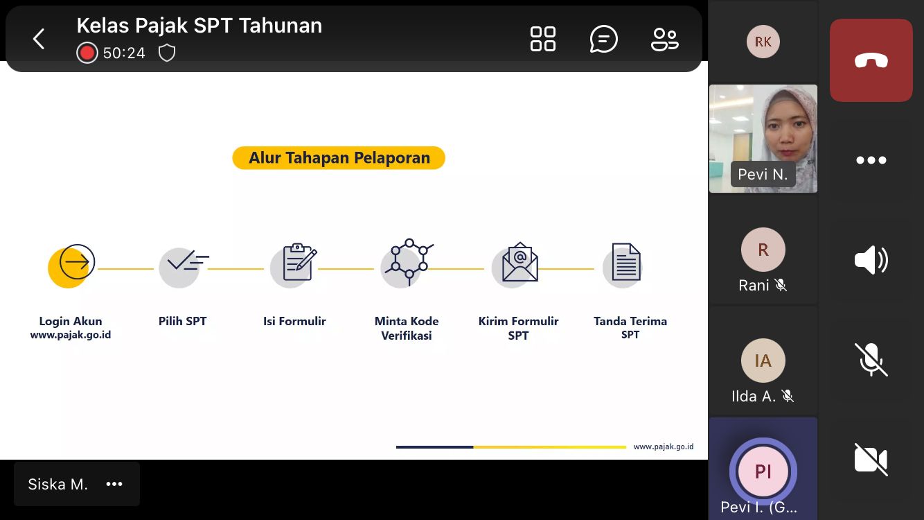 Sepuluh wajib pajak yang telah mendaftarkan diri sebelumnya, mengikuti kelas pajak yang berlangsung mulai pukul 14.30 WIB. Penyuluh Pajak KPP Pratama Bandung Cicadas Devita Nur Anggraini dan Pevi Ida Nurlaelasari menjadi narasumber kegiatan.