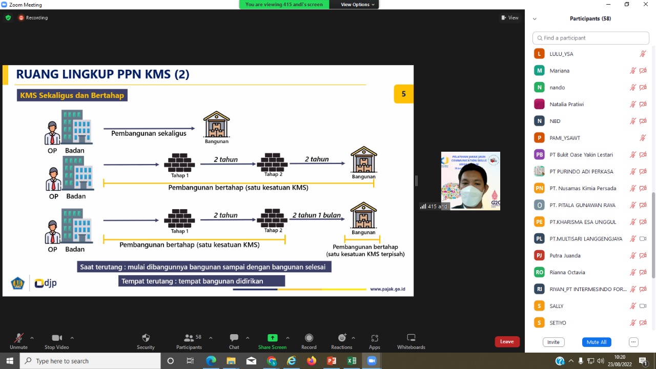 “Mungkin seperti yang sama-sama kita tahu bahwa tarif PPN secara umum adalah 11%, sedangkan tarif PPN KMS atau tarif pajak membangun sendiri ini dikenakan tarif khusus sebesar 2,2% dari Dasar Pengenaan Pajak (DPP),” ucap Andy.