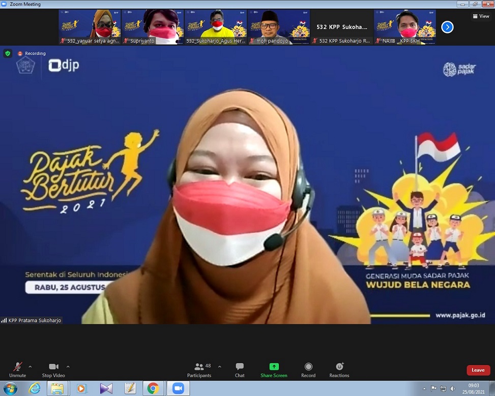 Kantor Pelayanan Pajak (KPP) Pratama Sukoharjo menyelenggarakan Pajak Bertutur secara daring menggunakan media aplikasi Zoom Meeting dengan SMA Al Azhar 7 Solo Baru di Sukoharjo (Rabu, 25/8). Acara ini diikuti oleh 32 perwakilan siswa-siswi SMA Al Azhar 7 Solo Baru, yang dimulai pukul 09.00 WIB dan berlangsung selama 180 menit.
