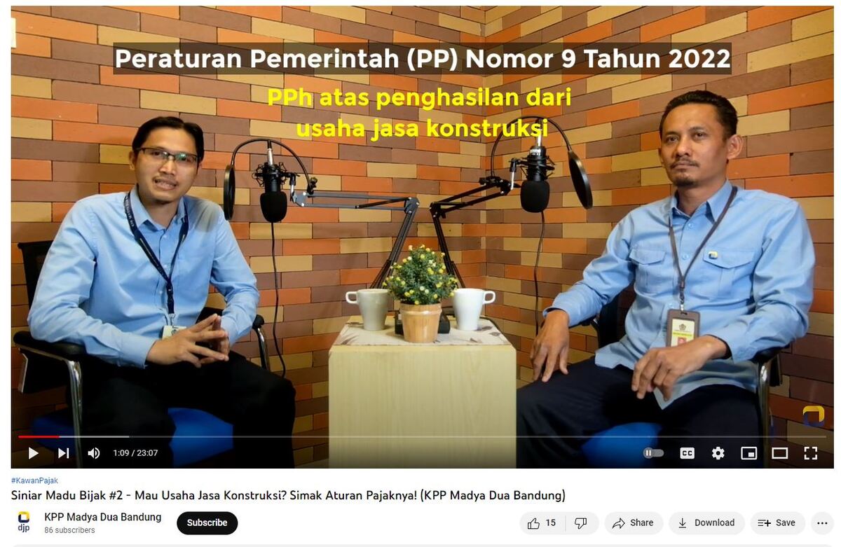 Kantor Pelayanan Pajak (KPP) Madya Dua Bandung kembali menggelar siniar dengan bahasan tentang Pajak Penghasilan atas Penghasilan dari Usaha Jasa Konstruksi. Kegiatan ini dilangsungkan di ruang siniar (podcast) KPP Madya Dua Bandung, Jalan Ibrahim Adjie nomor 372 Kota Bandung (Rabu, 28/12).
