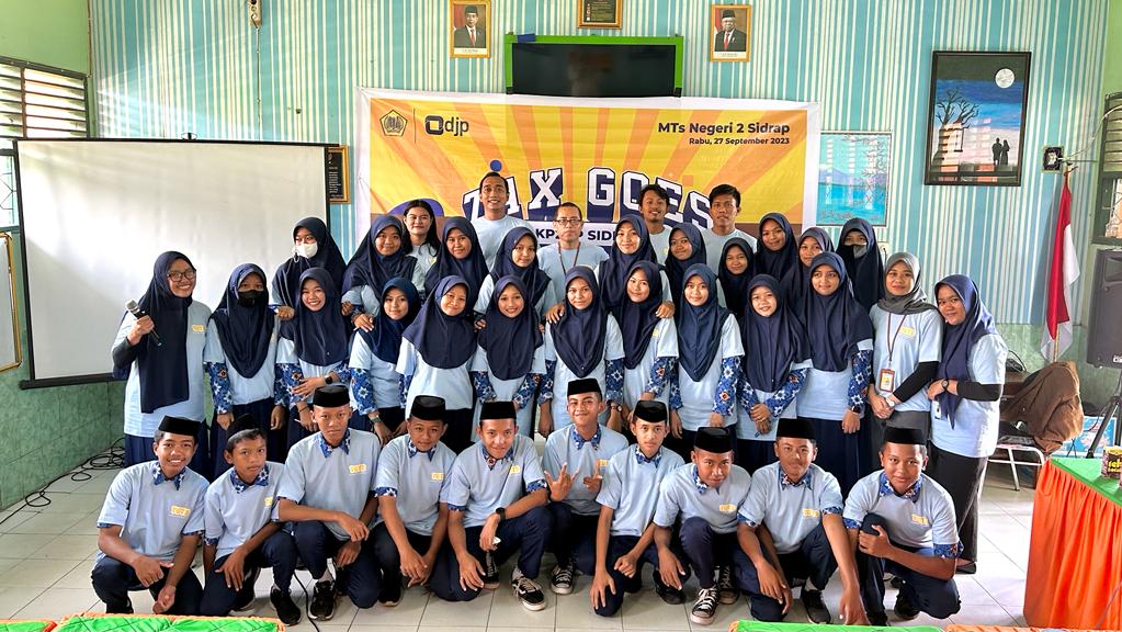 Kantor Pelayanan, Penyuluhan, dan Konsultasi Perpajakan (KP2KP) Sidrap bersama dengan MTS Negeri 2 Sidenreng Rappang menyelenggaran kegiatan Tax Goes to School (TGTS) Tahun 2023 di Aula Madrasah Tsanawiyah (MTS) Negeri 2 Sidenreng Rappang (Rabu, 27/9). Kegiatan yang bertema “Generasi Muda Sadar Pajak Wujud Bela Negara” ini diikuti oleh 30 siswa dan siswi dari MTS Negeri 2 Sidenreng Rappang.