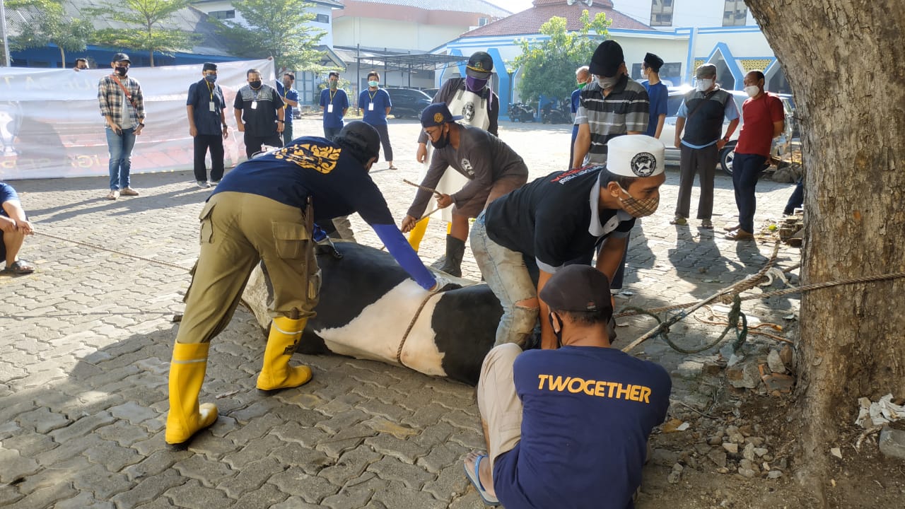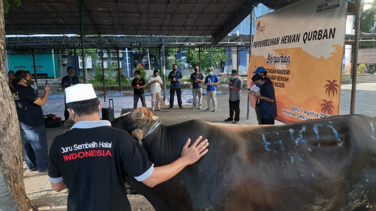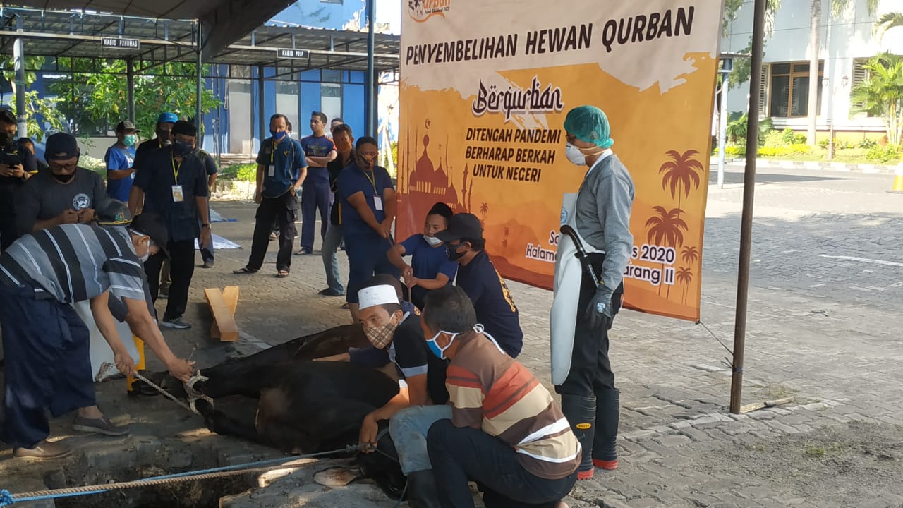 Pegawai Negeri Sipil (PNS) di lingkungan Gedung Keuangan Negara (GKN) Semarang II dan jemaah masjid Salahuddin melaksanakan kegiatan ibadah kurban dengan menyembelih empat ekor sapi dan empat ekor kambing di halaman GKN Semarang II (Sabtu, 1/8).