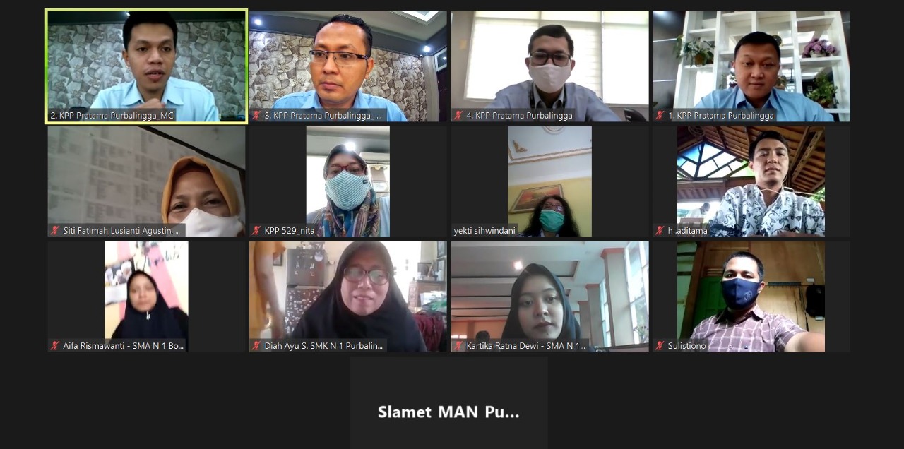 Dalam rangka meningkatkan kesadaran perpajakan melalui pendidikan, Kantor Pelayanan Pajak (KPP) Pratama Purbalingga mengadakan kegiatan Sharing Session Inklusi Kesadaran Pajak bersama guru mata pelajaran Pendidikan Pancasila dan Kewarganegaraan (PPKn) tingkat SMA/SMK/sederajat di Purbalingga secara daring melalui media Zoom Cloud Meetings di ruang rapat KPP Pratama Purbalingga (Rabu, 25/11).