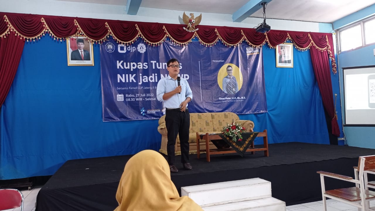 Fungsional Penyuluh Pajak Kanwil DJP Jawa Tengah II Timon Pieter sebagai narasumber menyampaikan materi tentang NIK sebagai NPWP Orang Pribadi. Ia mengatakan integrasi NIK menjadi NPWP diharapkan dapat menjadi salah satu solusi untuk mengatasi permasalahan kepatuhan wajib pajak (compliance gap) dalam sistem perpajakan Indonesia. Ia menjelaskan, secara teori terdapat empat pilar kepatuhan yaitu mendaftarkan diri, pelaporan, kepatuhan pembayaran, dan correct reporting atau melaporkan dengan benar. Maka melalui penggunaan NIK untuk perpajakan diharapkan bisa meningkatkan kepatuhan dalam mendaftarkan diri ke DJP.