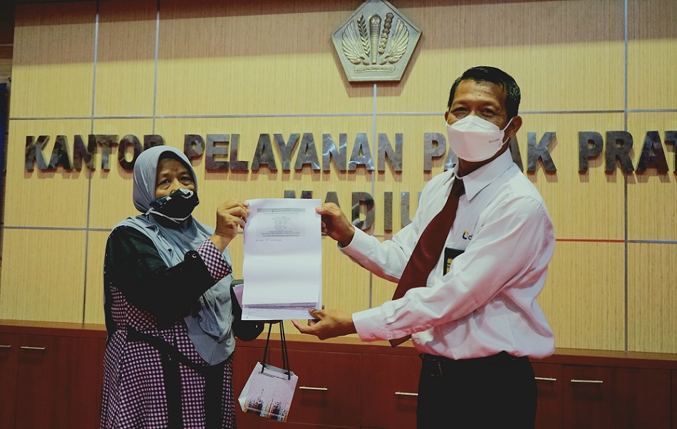 Kepala Kantor Pelayanan Pajak (KPP) Pratama Madiun Santoso Dwi Prasetyo memberikan apresiasi kepada dua wajib pajak yang telah melaporkan Surat Pemberitahuan (SPT) Tahunan di awal tahun ini. Siti dan Mahfud, dua orang wajib pajak pelaku UMKM datang langsung ke KPP Pratama Madiun di Jl. Mayor Jend. DI Panjaitan No.4, Pandean, Kec. Taman, Kota Madiun guna melaporkan SPT Tahunan tahun pajak 2021 (Senin, 3/1).