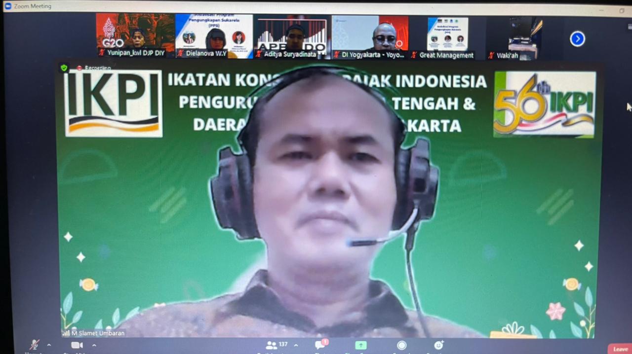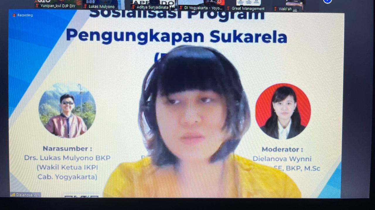 Ikatan Konsultan Pajak Indonesia (IKPI) Kota Yogyakarta dan Kantor Wilayah Direktorat Jenderal Pajak Daerah Istimewa Yogyakarta (Kanwil DJP DIY) menggelar sosialisasi Program Pengungkapan Sukarela (PPS) secara daring di Yogyakarta (Selasa, 15/03).