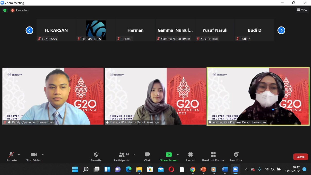 Kantor Pelayanan Pajak (KPP) Pratama Depok Sawangan kembali mengadakan kegiatan edukasi perpajakan bertajuk Kelas Pajak Program Pengungkapan Sukarela (PPS). Kegiatan yang digelar secara daring melalui Aplikasi Zoom Meeting ini dipandu langsung dari Depok, Jawa Barat (Rabu, 23/2).