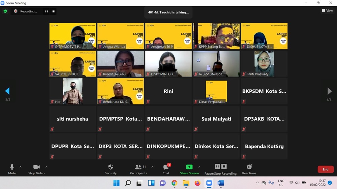 Kantor Pelayanan Pajak (KPP) Pratama Serang Barat melaksanakan Kegiatan Kelas Pajak online melalui aplikasi Zoom Meeting Pelaporan SPT Tahunan bagi para pegawai di seluruh lingkungan Instansi Pemerintah Kota Serang, Kota Serang (Selasa, 15/02).